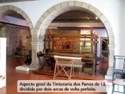 Aspecto geral da Tinturaria dos Panos de Lã, dividida por dois arcos de volta perfeita. Nesta ala da sala estão expostos, para além dos teares, uma carda manual com cavalete, que servia para abrir a lã (este objecto permitia que a pessoa designada para essa função estivesse sentada) e uma roda de fiar a pedal, que transformava a mecha da lã em fio. Este, ainda pouco resistente, passava para a caneleira manual, na qual se dava mais resistência ao fio, sendo essencialmente um trabalho realizado por crianças que nesta manufactura se encontravam alojadas em regime de internato.